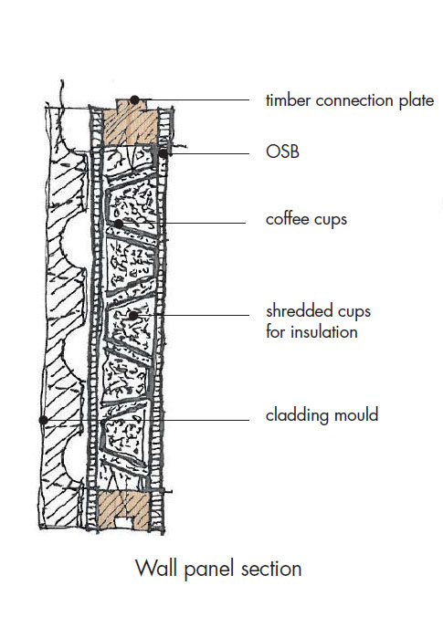 The pre-fabricated modular kit home incorporates used shredded coffee cups for insulation between timber frames, plus stacked coffee cups wrapped in waterproof membrane for rainwater pipes.