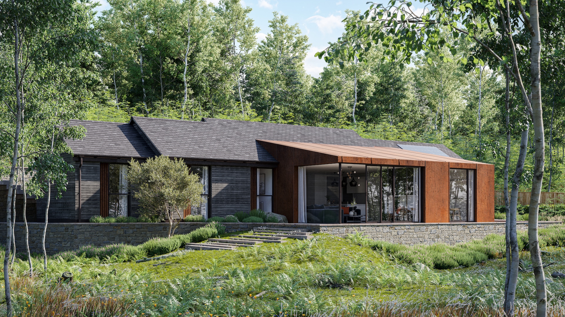 The material choices externally are sensitive to the protected setting, featuring Corten Steel, which is also used on National Trust buildings for its autumnal assimilation within tree-scapes.
