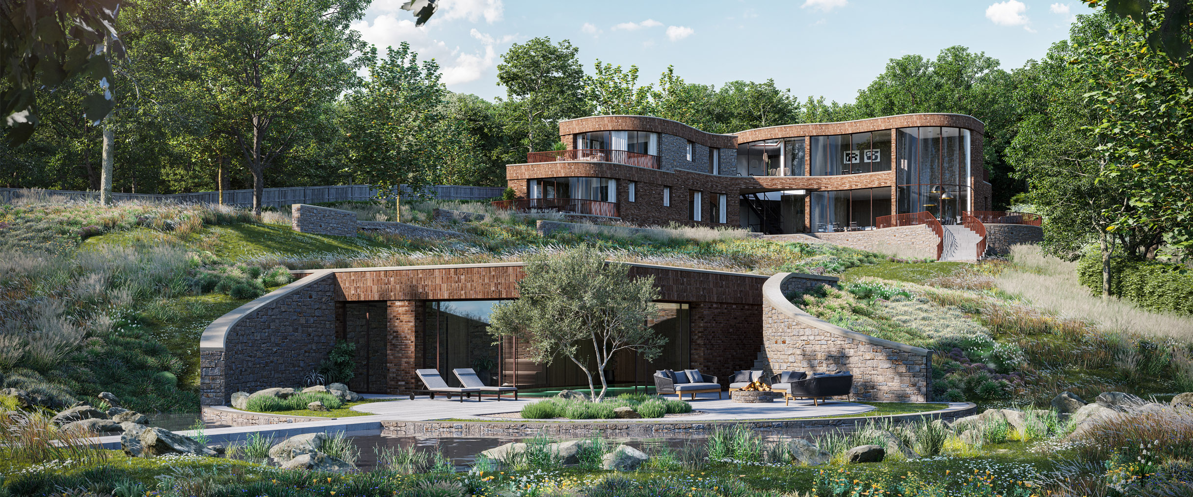 The front, north facing entrance appears single storey, with minimal design and openings. The true scale and ingenuity of the house reveals itself at the rear, maintaining the appearance of a two-storey dwelling with a hidden lower ground floor. The organic curved form with contemporary detailing of traditional materials, reduces the visible mass of the building which is further hidden due to the existing mature landscaping. A subterranean Pavilion with swimming pool is open on two sides and will be an oasis secluded from civilisation, to sit, relax and enjoy the ponds (formed as part of the water management of the site) and wider landscape of the forest beyond.
