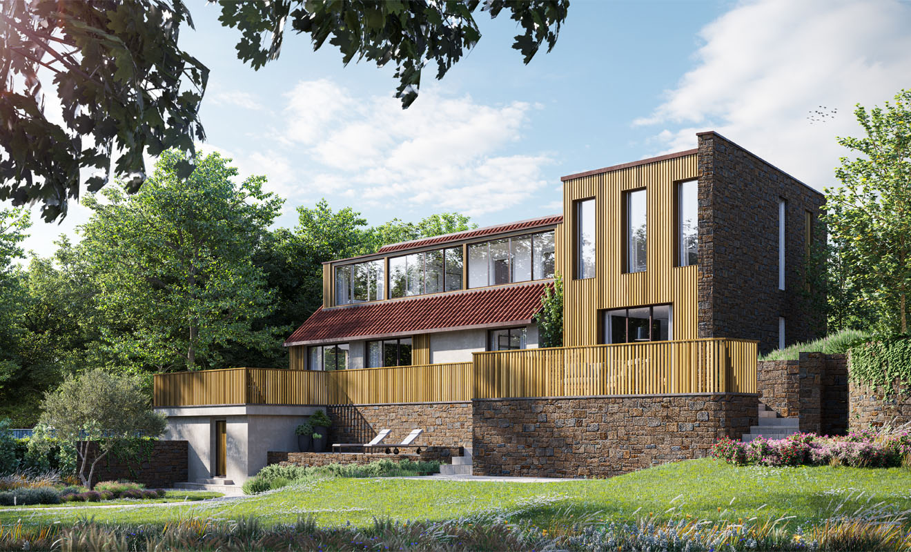 The Barn was developed through massing exploration so that the bold extension, clad in stone, would sit comfortably against the rather low roof form of the existing and feel connected to it. We wanted to make a contemporaneous statement without overshadowing or being disproportionate to that of the existing house, contributing positively to the mixture of varied surrounding properties, all of which are key to getting planning within the Green Belt.