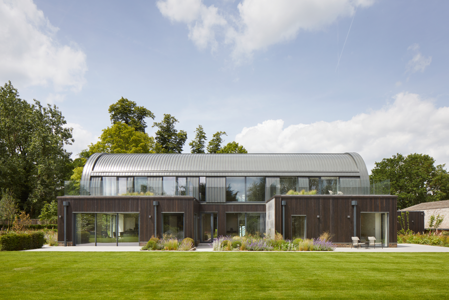 The resulting home is an eye-catching steel frame, curved roof building finished in timber boards. Zinc cladding was used for the roof and rainwater system to establish a sleek, cohesive aesthetic. The gable ends and rear wall of the structure feature expansive swathes of glazing, allowing natural light to penetrate deep into the heart of the property.