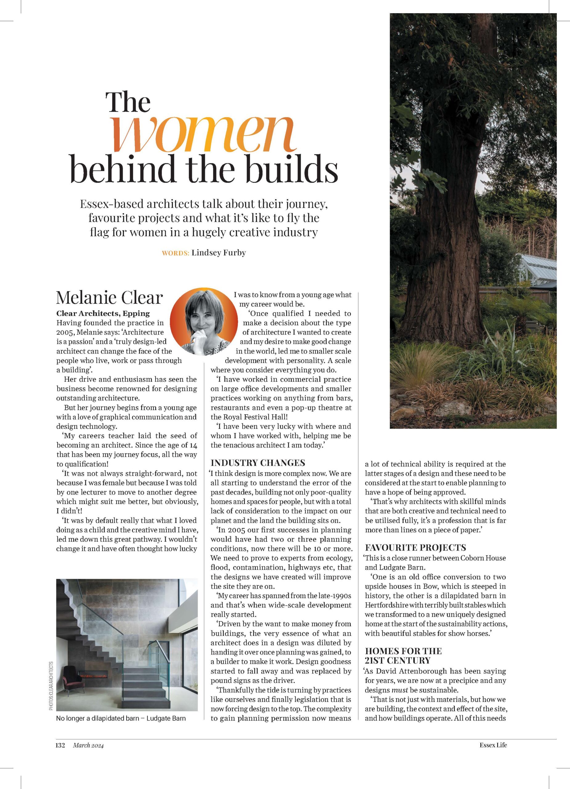 Essex Life magazine has celebrated the work of female architects in their latest issue, leading with our very own Melanie Clear. From early routes into the industry through to the changing face of architecture, the article looks in detail at what makes female architects tick, including their inspirations and favourite projects.
