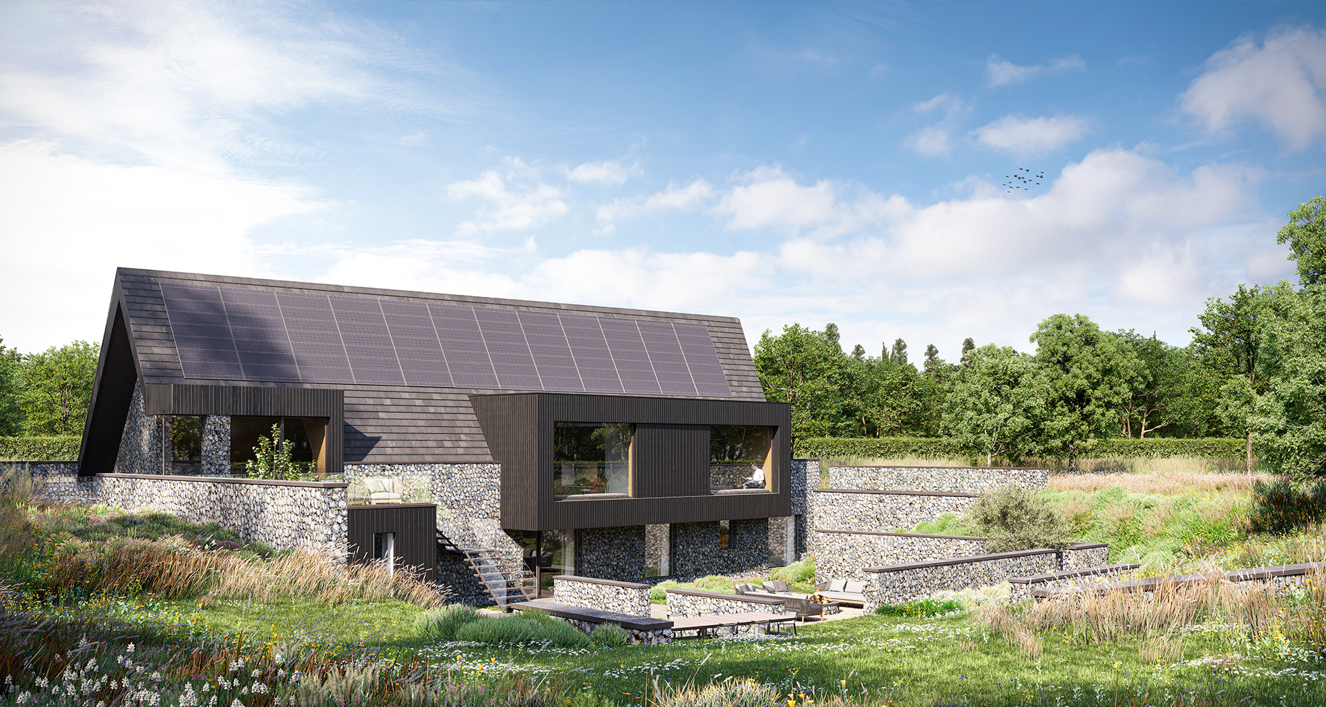 - Strong external materials crafted locally, including chalk knapped flint and Shou-Sugi-Ban charred black timber cladding