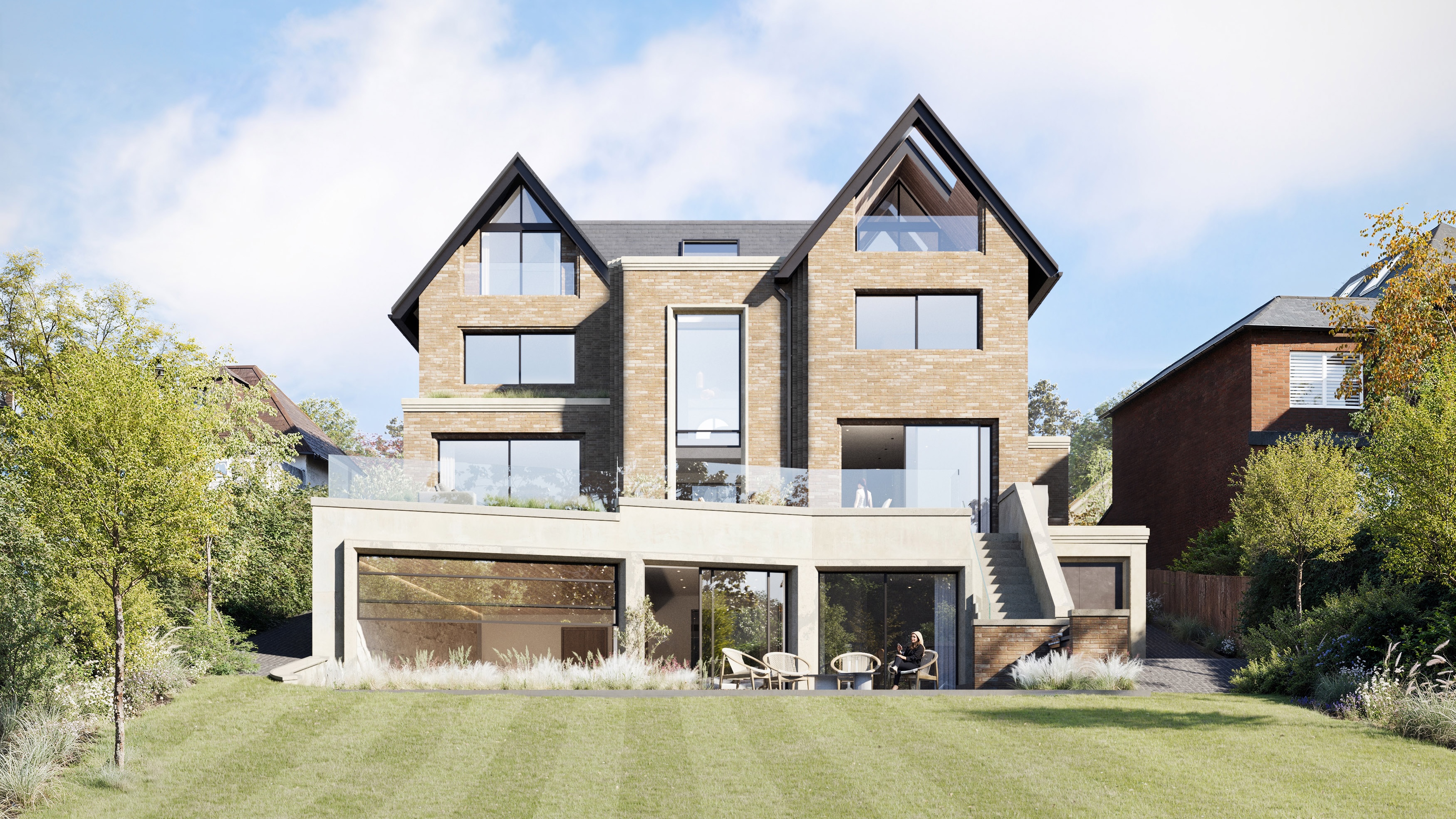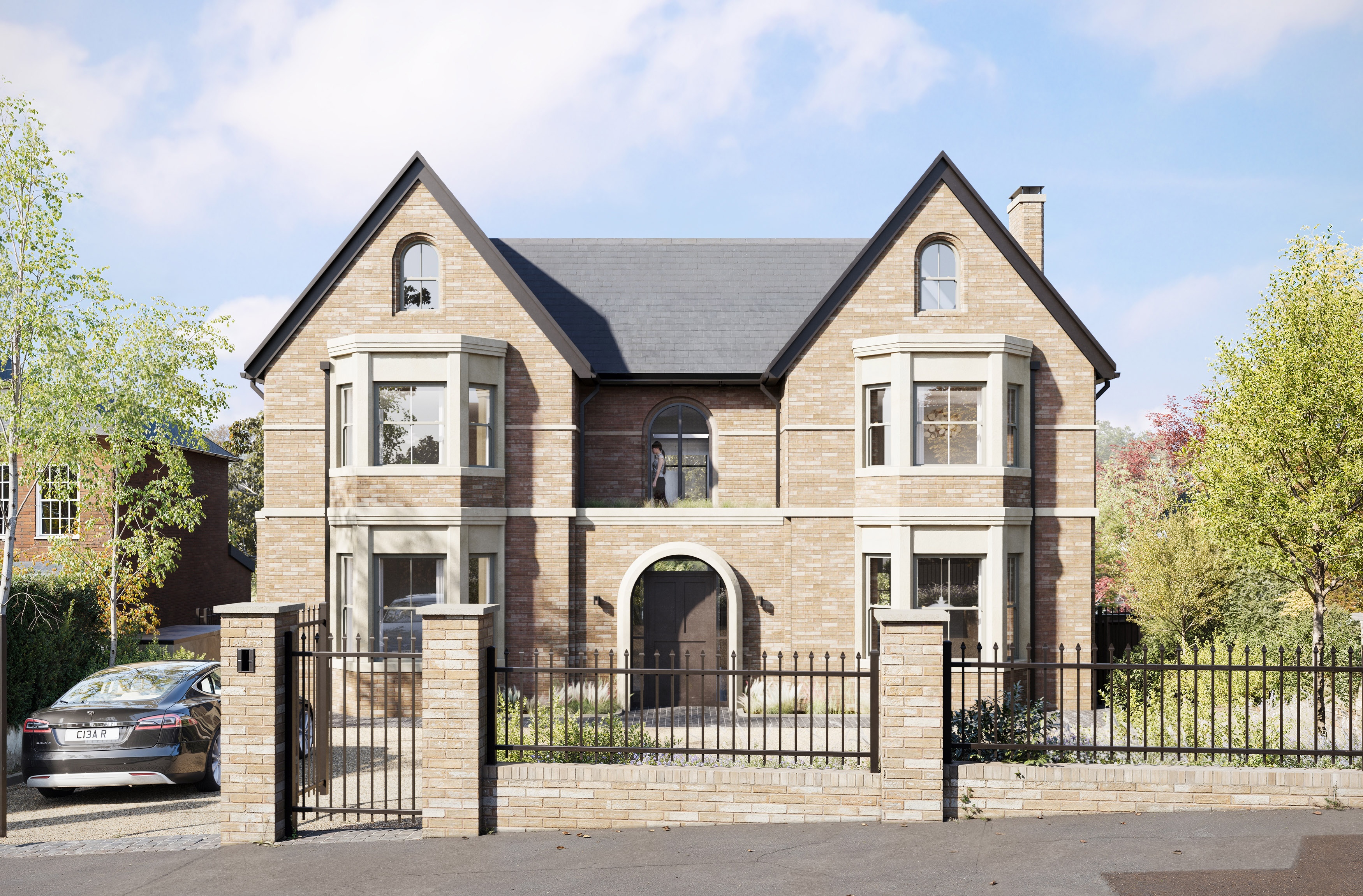 The finished structure features an elegant design balancing the traditional with contemporary aesthetics. Our client-driven traditional, symmetrical frontage includes twin gables, double-fronted bays, and a feature arched entrance with modern bronze window frames and cast stone detailing - a tying togther of old and new. The rear form is significantly more modern in design, featuring steps in the façade to break up the form and create harmony with the neighbours who both supported the scheme. A big help at the planning committee.